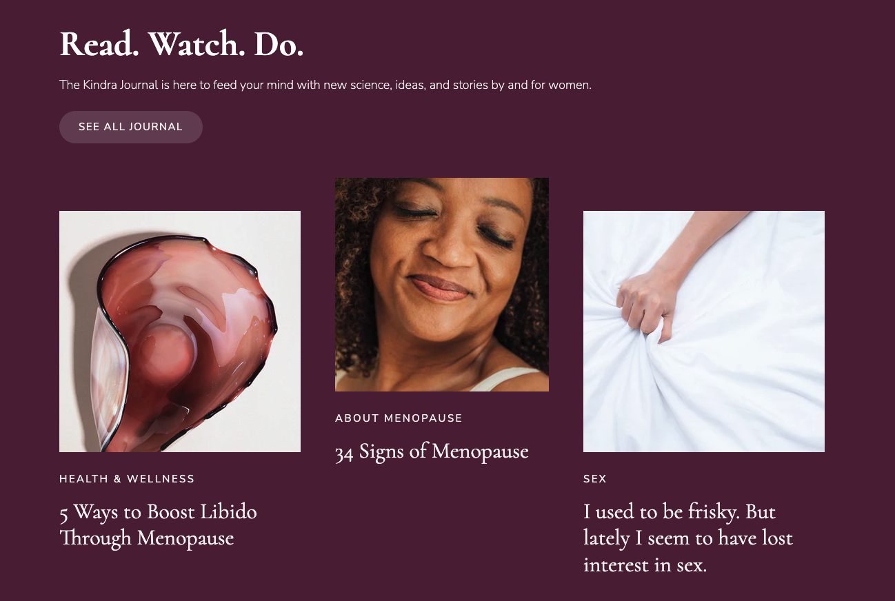 ![]()  KindraI write and edit in-depth, scientific content for menopause brand Kindra’s Journal, with the goal of giving women more information about common (but rarely discussed) menopause symptoms.